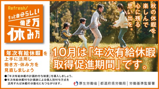 10月は「年次有給休暇取得促進期間」です。年次有給休暇を取得しやすい環境づくりに取り組みましょう。