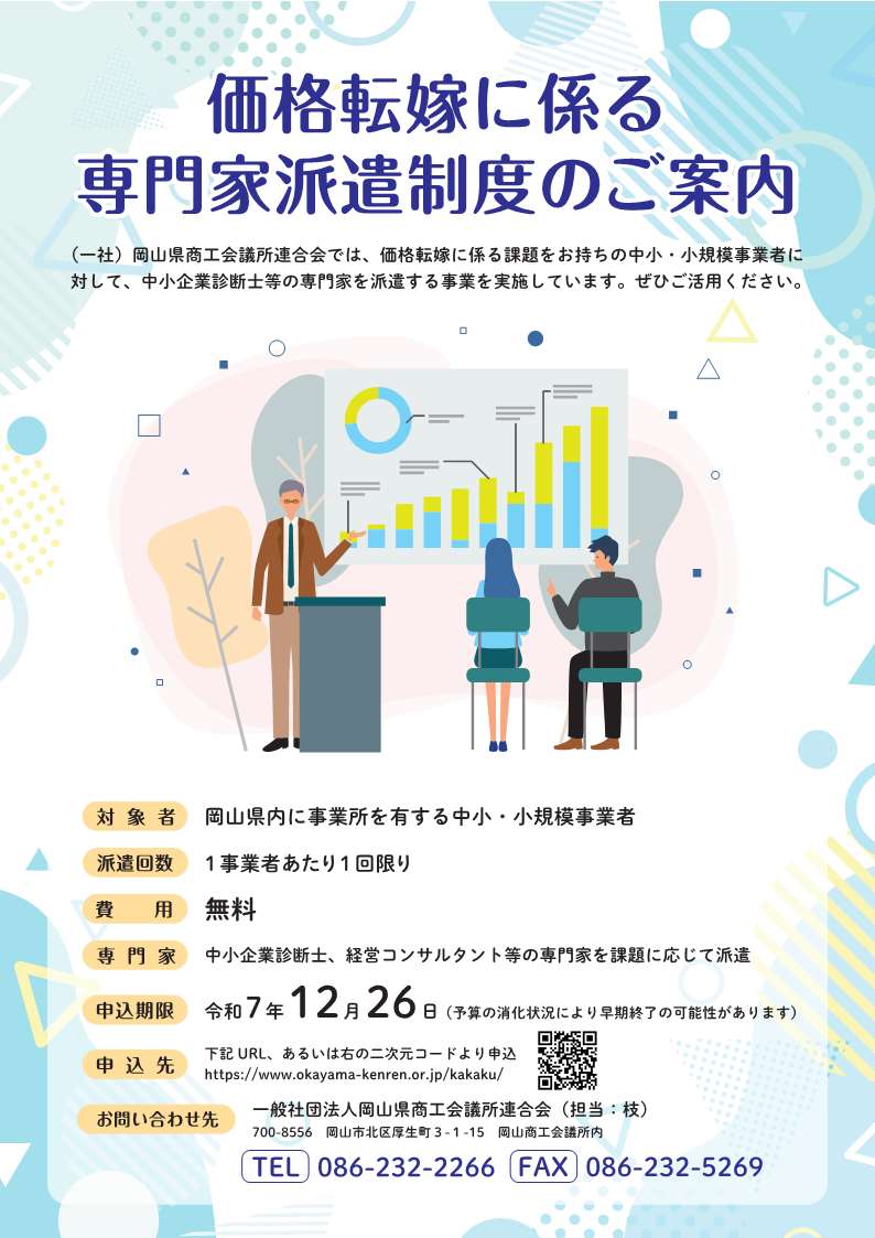 (一社)岡山県商工会議所連合会では、価格転嫁に係る課題をお持ちの中小・小規模事業者に対して、中小企業診断士等の専門家を派遣する事業を実施しています。ぜひご活用ください。