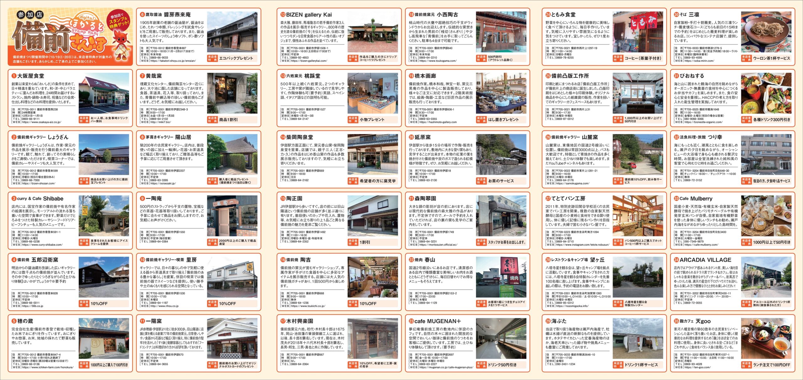 大阪屋食堂、備前焼ギャラリーしょうざん、Curry&Café Shibabe、備前焼 五郎辺衛窯、穂の蔵、鷹取醤油 醤房燕来庵、黄哉窯、茅葺きギャラリー陽山居、一陶庵、備前焼ギャラリー・喫茶里房、一陽窯、BIZEN Gallery Kai、六姓窯元 桃蹊堂、柴岡陶泉堂、陶正園、備前焼 陶吉、木村興楽園、備前焼窯元 小西陶古、橋本画廊、延原窯、森陶翠園、焼肉 春山、cafe MUGENAN+、ともみ食堂、備前凸版工作所、備前焼ギャラリー 山麓窯、てとてパン工房、レストラン&キャンプ場 望ヶ丘、海ぶた、そば三凛、びおねする、活魚料理・旅館 つり幸、Café Mulberry、ARCADIA VILLAGE、麹カフェ天goo