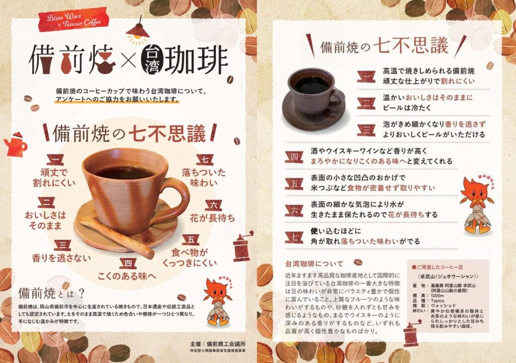11月1日から日本4店、台湾6店の10店のカフェ(コーヒーショップ)において、備前焼コーヒーカップでコーヒーを提供し、ご意見ご感想について回答していただくキャンペーンを実施します。日本4店においては、台湾珈琲を使って提供します。(実施期間は1か月間ですが、提供予定数終了次第終了します。主催:備前商工会議所)