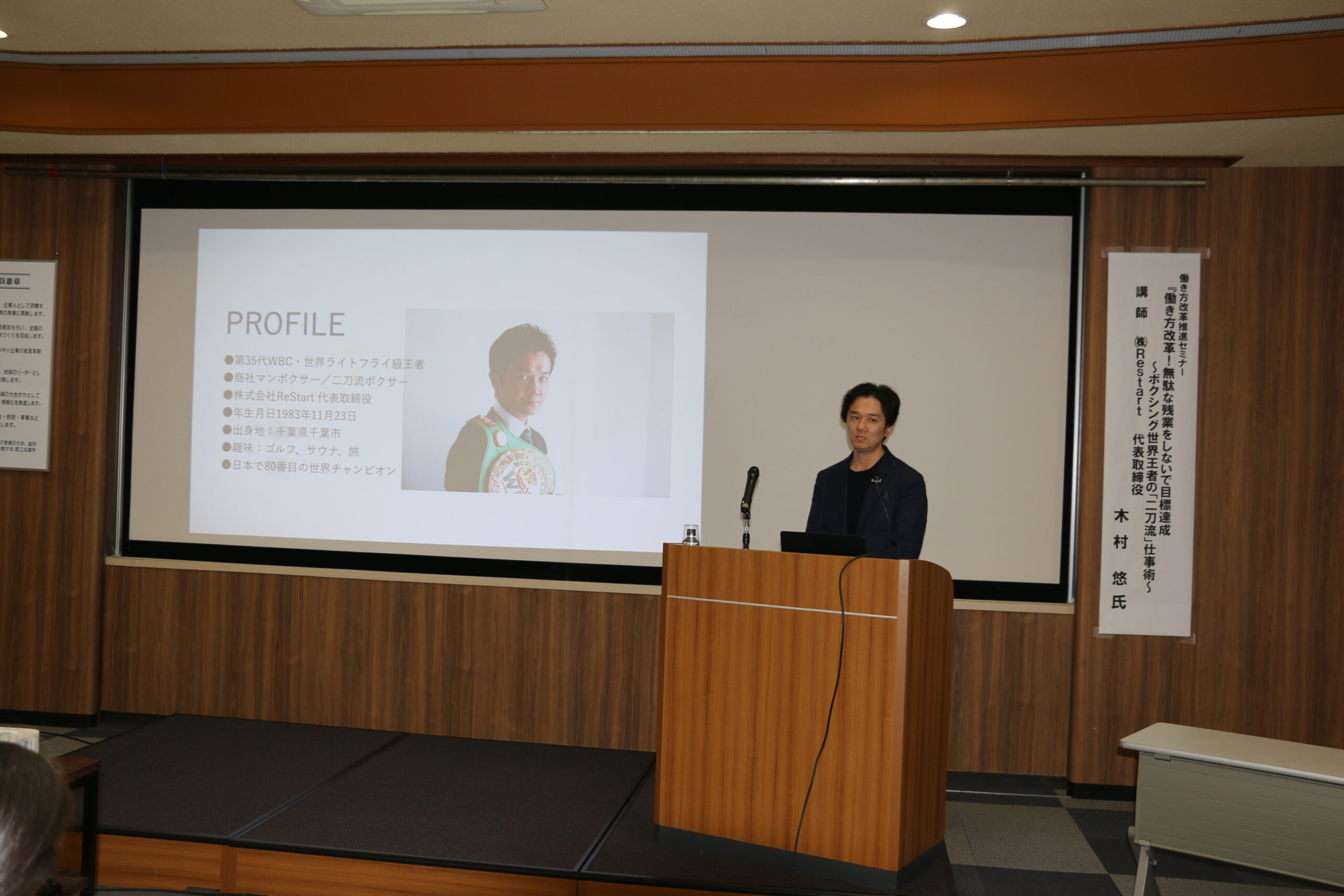 当所では、令和8年1月21日に働き方改革推進セミナーを開催しました。講師には商社マンとプロボクサーという「二刀流」を実践し、世界チャンピオンにのぼりつめた木村悠氏をお招きし、限られた時間で最大の成果を出すための実践的ノウハウをお伺いしました。