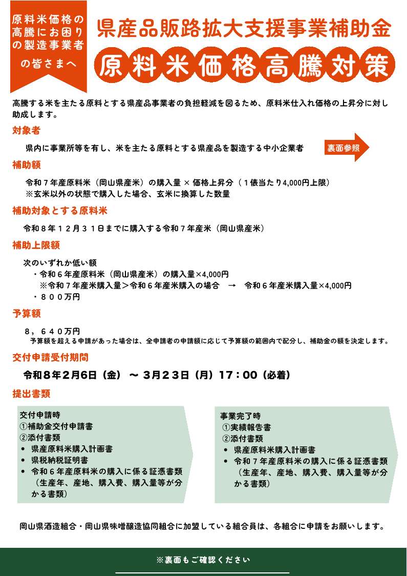 高騰する米を主たる原料とする県産品事業者の負担軽減を図るため、原料米仕入れ価格の上昇分に対して助成します。様式等詳細は岡山県産業労働部マーケティング推進室のホームページをご確認下さい。