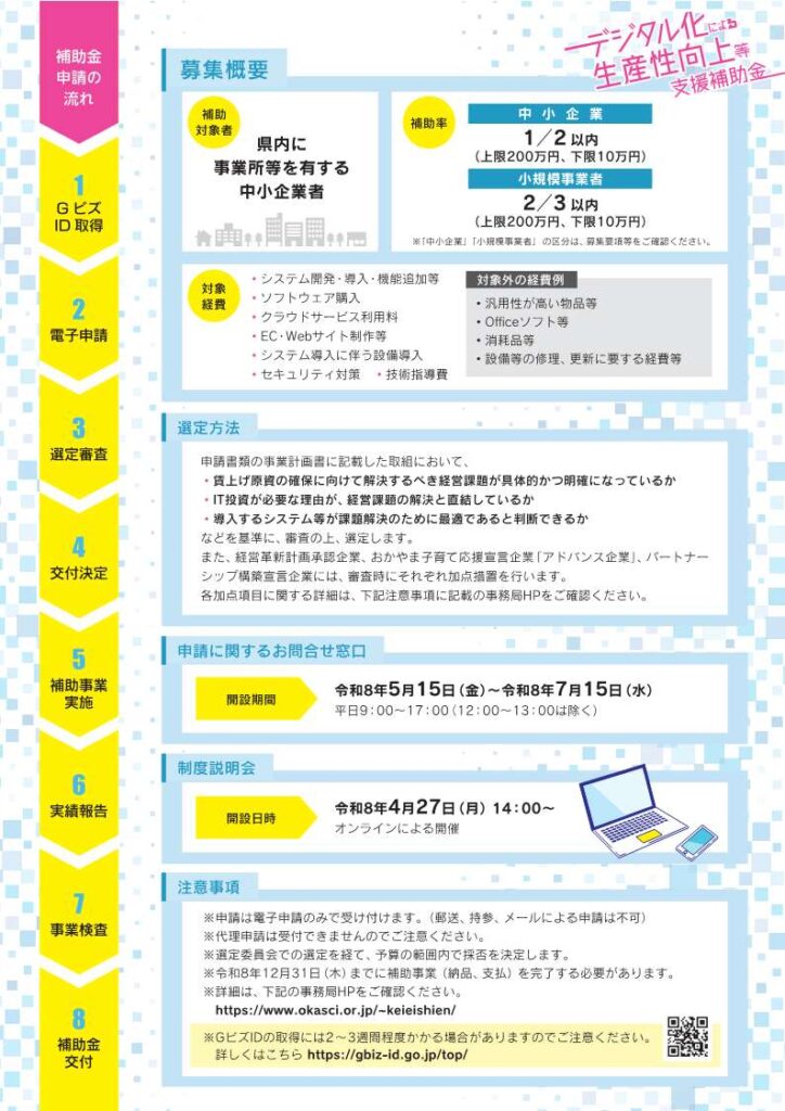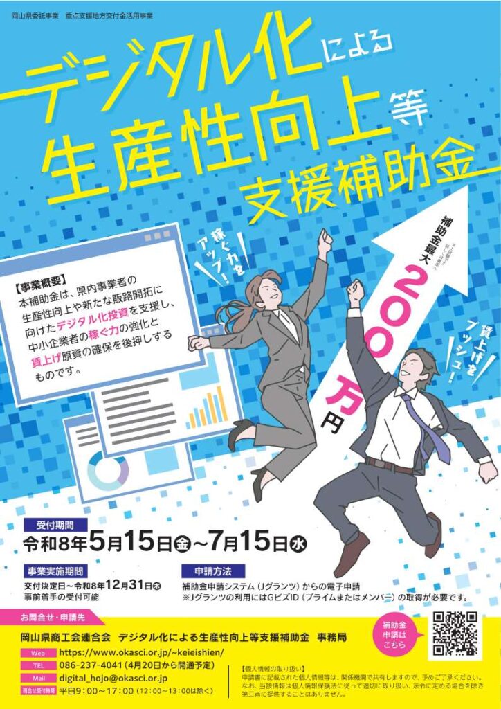 「デジタル化による生産性向上等支援補助金」を5月15日(金)より申請の受付を開始します。岡山県内事業者の「生産性向上」と「賃上げ」の実現に向けて、デジタル化への挑戦を、本補助金が強力にバックアップします。